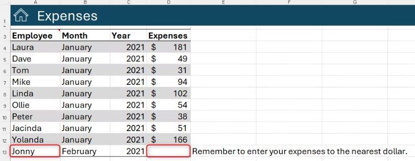 여기서 E열의 지침은 (1) 해당 행의 D열 셀에 숫자가 없고, (2) 해당 행의 A열 셀에 텍스트가 있는 경우에만 나타납니다. 즉, 누군가 다음 빈 행에 이름을 입력하는 즉시 지침이 나타나고, 누군가 지출 열에 숫자 값을 입력하는 즉시 지침이 사라집니다.