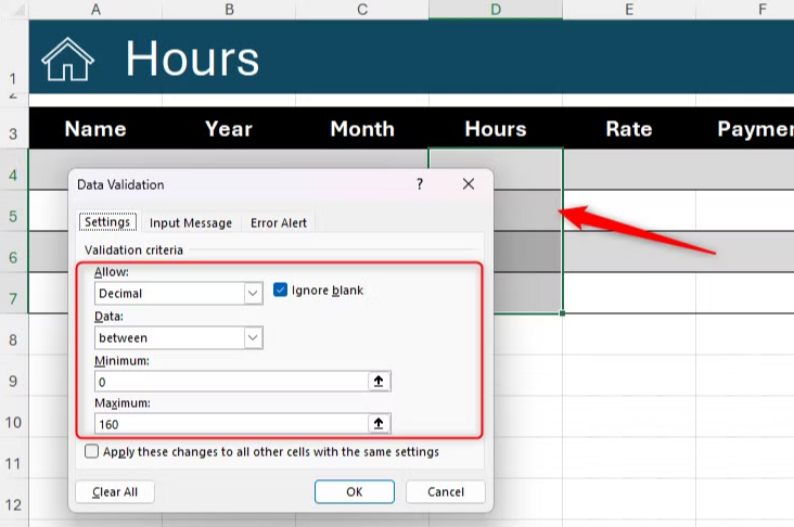 데이터 유효성 검사 도구는 셀에 드롭다운 옵션 목록을 추가하는 데 가장 일반적으로 사용되지만 , 이것이 유일한 기능은 아닙니다. 예를 들어, 셀의 문자 수를 제한하거나 입력 가능한 데이터 유형을 정의하는 규칙을 만들 수 있습니다. 여기서는 시간 열의 입력을 0~160 사이의 10진수로 제한했습니다.