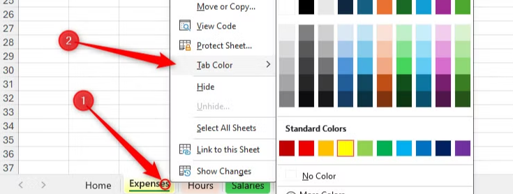 각 탭을 두 번 클릭하여 각 워크시트에 이름을 지정하는 것 외에도 탭을 우클릭하고 시트 탭의 색상을 변경했습니다.