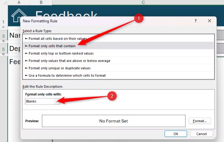 (3) 새 서식 규칙 대화 상자에서 "다음을 포함하는 셀만 서식 지정"을 선택하고, "다음을 포함하는 셀만 서식 지정" 옵션에서 "빈칸"을 선택합니다.