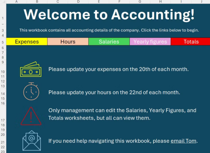 공동 작업자가 Excel 통합 문서를 탐색하는 데 도움을 주는 가장 효과적인 방법 중 하나는 홈페이지 워크시트를 추가하는 것입니다. 이 시트는 사람들이 통합 문서를 열 때 가장 먼저 보게 되는 부분으로, 환영하는 제목, 통합 문서의 내용 요약, 주요 워크시트 링크, 그리고 읽는 사람이 따라야 할 단계 등을 포함해야 합니다.