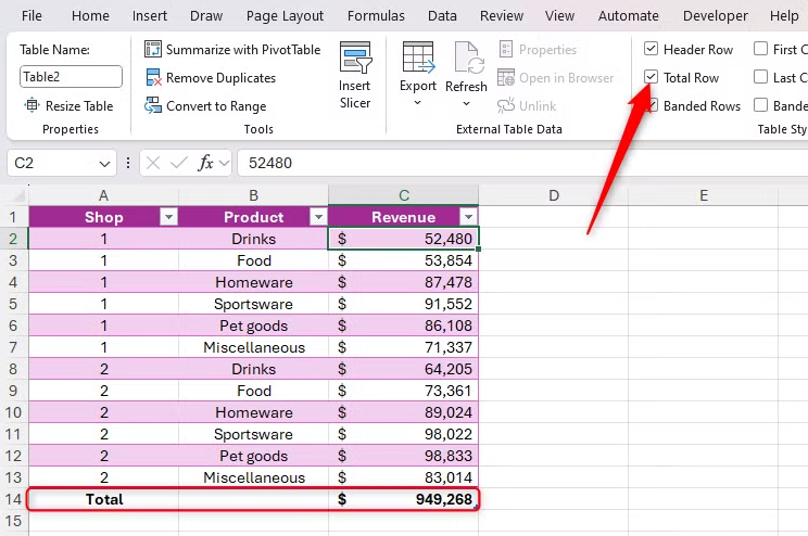 하지만 도구를 사용하기 전에 표에 합계 행을 추가할지 여부를 결정해야 합니다 . Excel에서는 합계 행을 그림에 소급적으로 추가할 수 없기 때문입니다. 합계 행을 추가하려면 표에서 아무 셀이나 선택하고 '표 디자인' 탭에서 "합계 행"을 선택합니다.