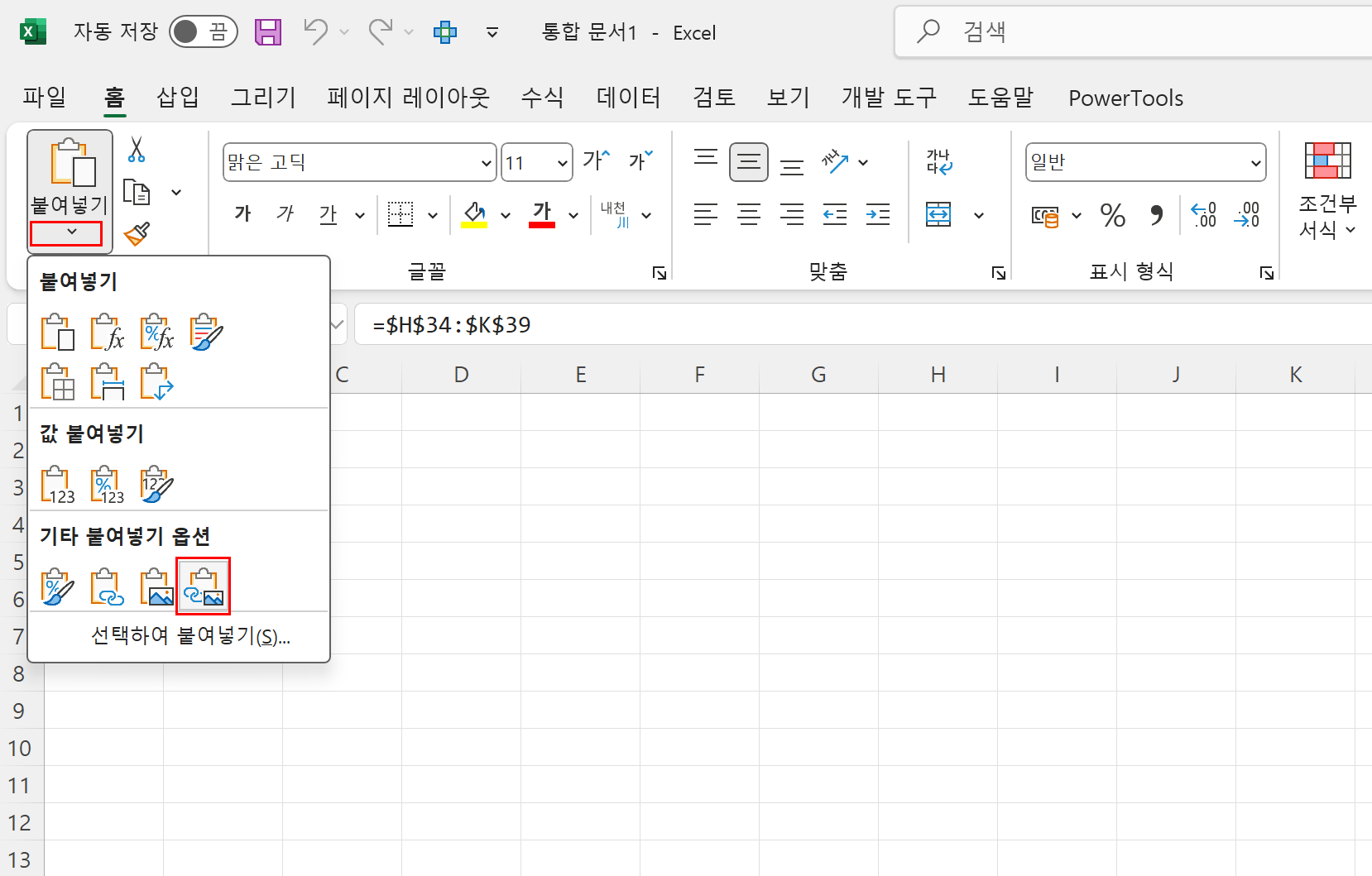 위 조건을 충족하면 리본의 홈 탭에서 연결된 그림 도구를 찾을 수 있습니다. [붙여넣기] 명령 아래쪽의 드롭다운을 클릭하고 [연결된 그림] 명령을 선택하세요.
