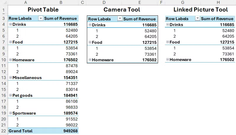 Excel에서 카메라 및 연결된 그림 도구를 사용하여 피벗 테이블을 캡처할 수 있다는 것은 놀라운 일입니다. 피벗 테이블은 빠르고 쉽게 데이터를 분석할 수 있도록 확장 및 축소되도록 특별히 설계되었기 때문입니다.