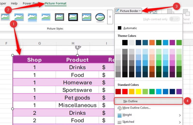 또한, 카메라 도구를 사용하여 만든 그림에는 테두리가 적용되어 있기 때문에 복사한 표에도 테두리가 있으면 이상하게 보입니다. 따라서 이미지를 선택하고 그림 서식 탭에서 [그림 테두리] - [윤곽선 없음]을 클릭합니다.