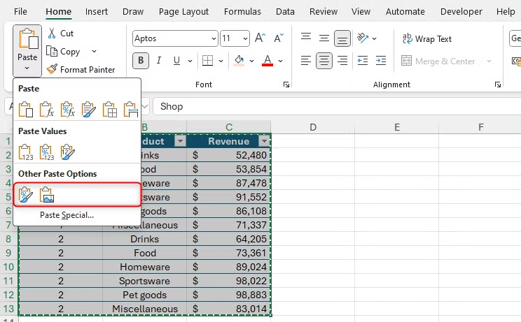연결된 그림 도구를 사용하여 Excel 표로 서식이 지정되지 않은 범위의 스냅샷을 찍으려면 데이터를 선택하고 Ctrl + C를 눌러 복사한 다음, 붙여넣기 드롭다운 메뉴에서 [값 및 원본 서식 명령을 클릭합니다.