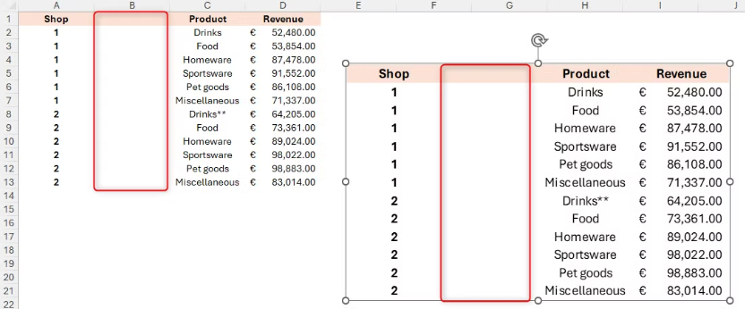 카메라 도구를 사용하여 일반 셀을 캡처할 때와 마찬가지로, 데이터 중앙에 열과 행을 추가하면 사진에 해당 내용이 반영됩니다. 마찬가지로, 열이나 행을 삭제하면 이미지에 반영됩니다.