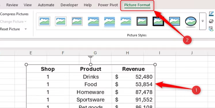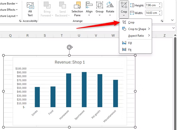 카메라 및 연결된 그림 도구를 사용하여 차트를 캡처하는 아이디어를 여전히 선호한다면 차트 가장자리 주변의 셀을 선택하고 도구를 활성화한 다음 그림 서식 탭의 자르기 도구를 사용하여 이미지에서 주변을 잘라냅니다.