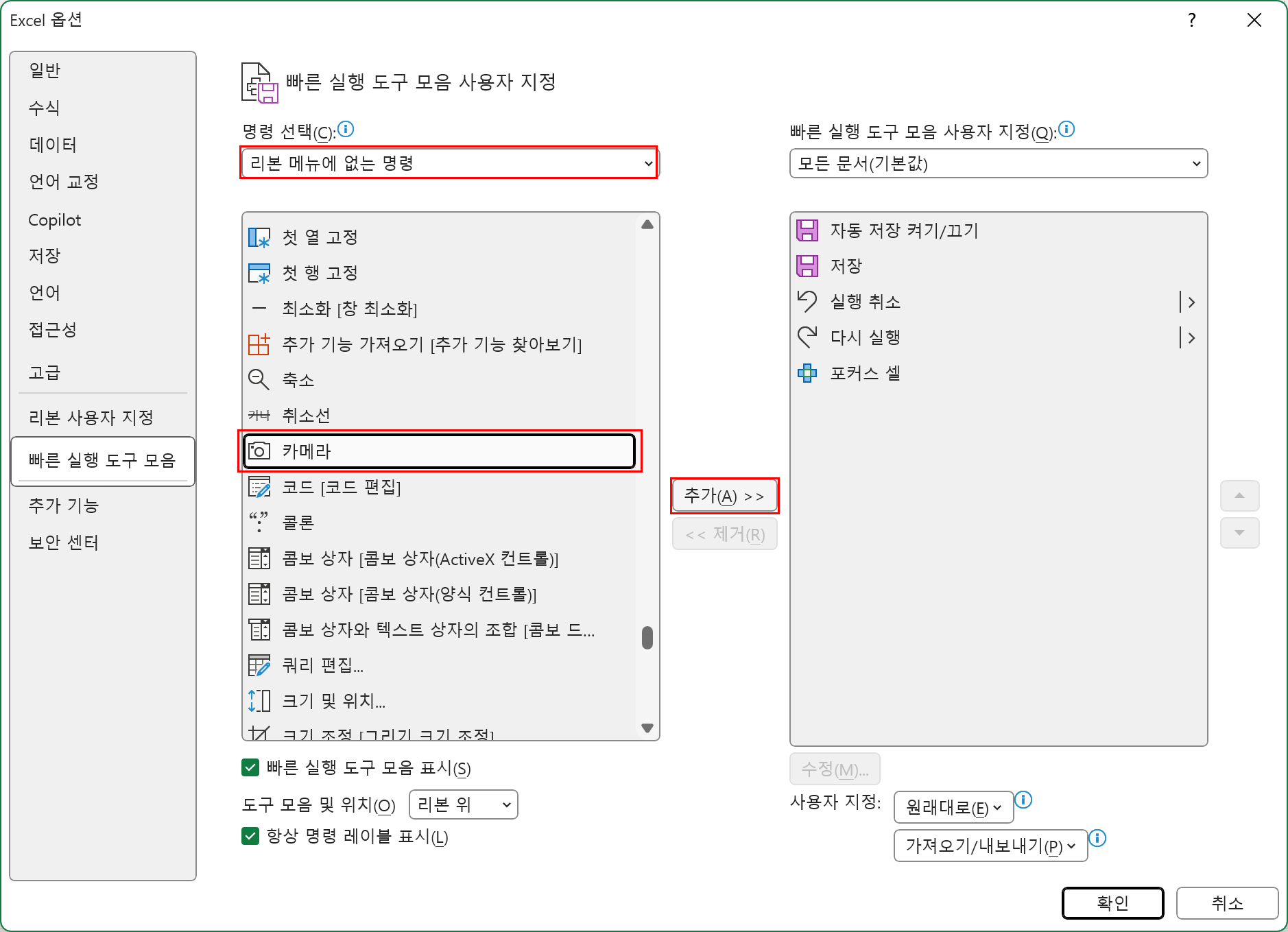 (3) Excel 옵션 대화 상자에서 [명령 선택] - [리본 메뉴에 없는 명령'을 선택합니다. 아이콘 중에서 [카메라]를 선택[추가] 버튼을 클릭하여 QAT에 추가하고 [확인]을 누릅니다.
