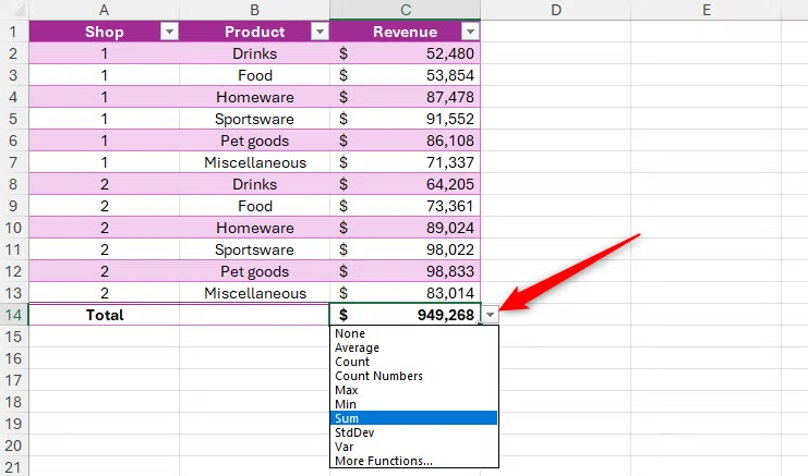 그런 다음, 전체 셀을 선택하고 아래쪽 화살표를 클릭하여 데이터 집계 방법을 선택합니다.