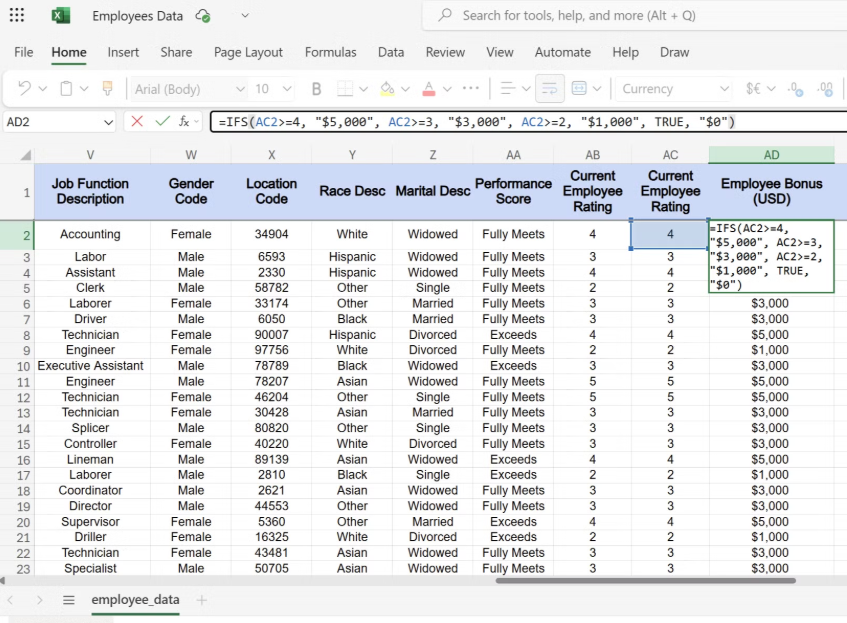IFS 함수는 바로 이러한 상황에서 여러분의 정신 건강을 지켜줍니다. IFS 함수는 여러 시나리오를 효과적으로 관리합니다. 성과 등급에 따른 직원 보너스 계산의 경우, 다음 수식과 같이 IFS 함수를 사용할 수 있습니다.