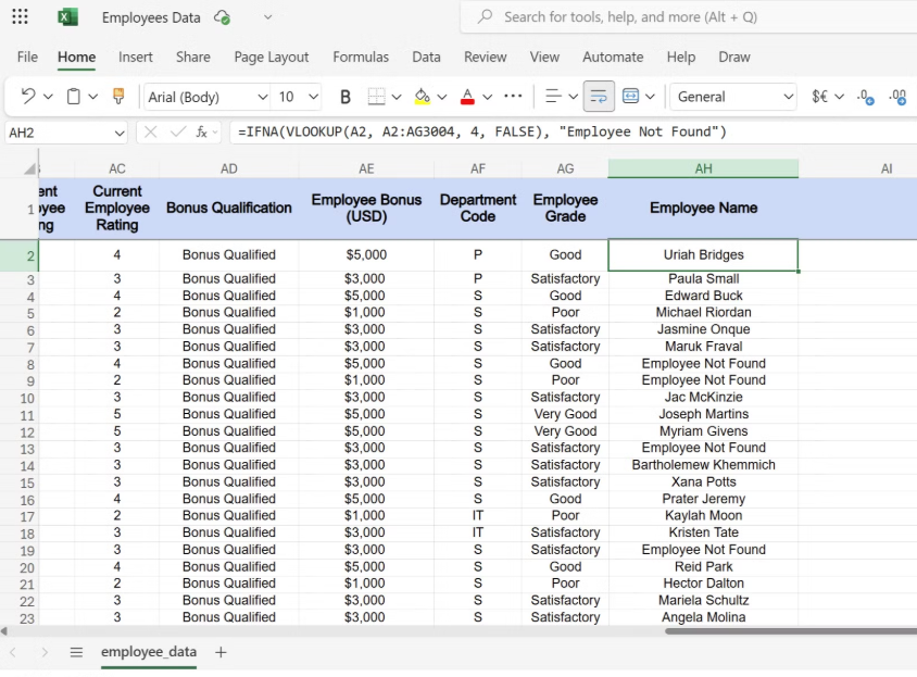 이 수식은 직원 목록 범위 내 A2열에서 직원 ID를 검색하여 네 번째 열의 이름을 반환합니다. 직원 ID가 데이터베이스에 없는 경우, #N/A 대신 사용자 친화적인 "직원을 찾을 수 없음" 메시지를 표시합니다.