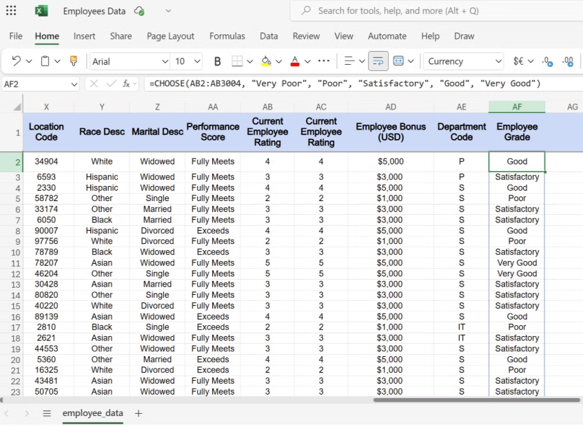구문은 간단합니다. 첫 번째 인수는 직위 번호이고, 그 뒤에 값 목록이 옵니다. 직원 스프레드시트 예시를 참고하여, 이 함수를 사용하여 숫자 등급을 읽기 쉬운 설명으로 변환할 수 있습니다.