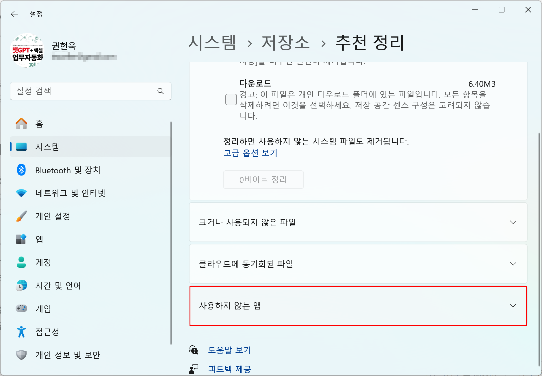 [설정] - [시스템] - [저장소] - [추천 정리] - [사용하지 않는 앱]으로 이동하면 안전하게 제거할 수 있는 앱 목록이 표시됩니다. [앱] - [설치된 앱]으로 이동하여 크기별로 정렬하면 더 이상 사용하지 않는 큰 앱을 찾을 수 있습니다. 찾으면 하나씩 제거하세요.