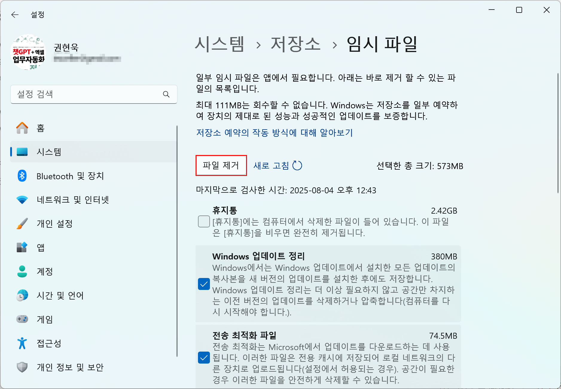 사용하지 않는 파일을 확인하려면 [설정] - [시스템] - [저장소] - [정리 권장 사항] - [대용량 또는 사용하지 않는 파일]로 이동합니다. PC Manager 앱을 사용하여 PC에 있는 모든 대용량 파일을 찾을 수도 있습니다.
