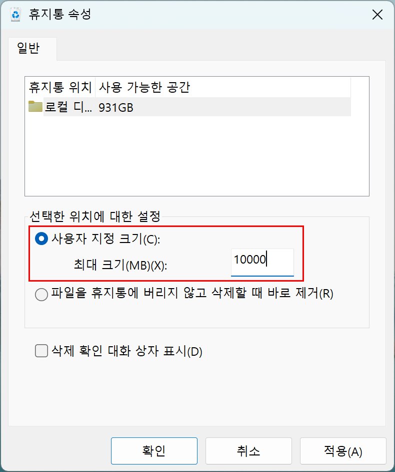 휴지통 아이콘을 우클릭하고 [속성]을 선택하여 저장 공간 한도를 설정할 수 있습니다. 예를 들어, 10GB를 할당하면 Windows는 해당 한도에 도달하면 가장 오래된 파일부터 삭제하여 새 파일을 위한 공간을 확보합니다.