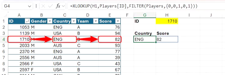 XLOOKUP은 인접한 여러 셀의 결과를 반환하는 데에도 사용할 수 있습니다. 여기서 G4 셀의 수식은 ID를 입력하면 선수의 성별, 국가, 팀, 점수를 반환합니다. 조회 값(인수 c )은 첫 번째 열, 콜론, 마지막 열로 구성됩니다.