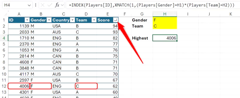 INDEX와 XMATCH를 함께 사용하면 논리 연산자를 사용하여 여러 기준을 결합하여 값을 반환할 수도 있습니다. E열을 내림차순으로 정렬한 후, 다음 수식을 사용하여 C팀에서 가장 높은 점수를 받은 여성의 ID를 반환할 수 있습니다.