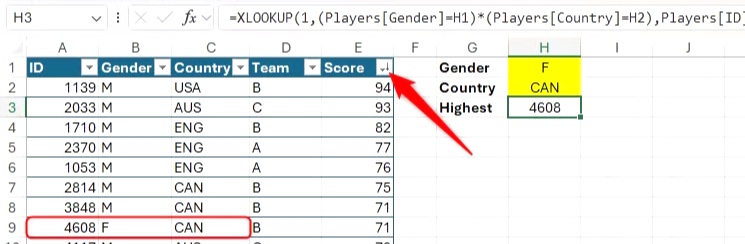 =XLOOKUP(1, (Players[Gender]=H1) * (Players[Country]=H2), Players[ID])