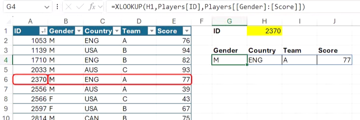 =XLOOKUP(H1, Players[ID], Players[[Gender]:[Score]])