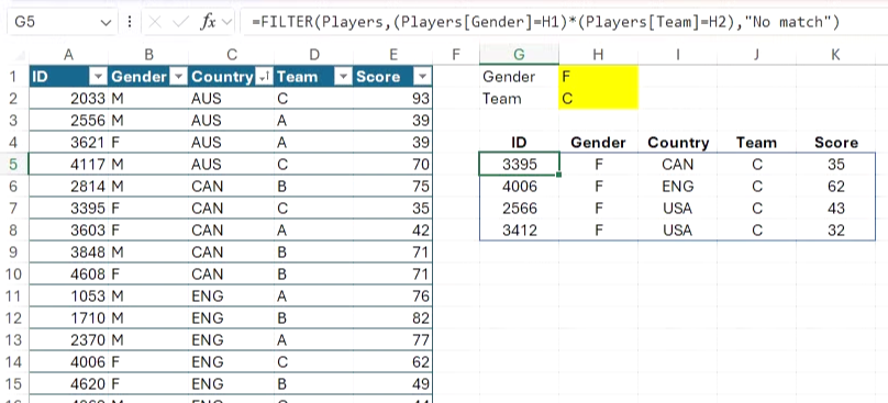 =FILTER(Players, (Players[Gender]=H1) * (Players[Team]=H2), "No match")
