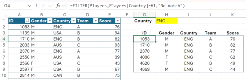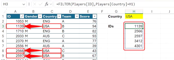 FILTER 함수를 사용하면 단일 기준에 따라 열에서 배열을 반환할 수 있습니다. H3 셀에 다음 수식을 입력하면 H1 셀의 값과 일치하는 국가를 가진 모든 플레이어의 ID가 반환되며, 일치하는 항목이 없는 경우 오류 대신 "일치하지 않음"이 반환됩니다.