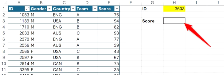 XLOOKUP은 단일 기준에 따라 단일 값을 반환할 수 있습니다. H3 셀의 수식은 H1 셀의 ID에 따라 플레이어의 점수를 반환합니다.