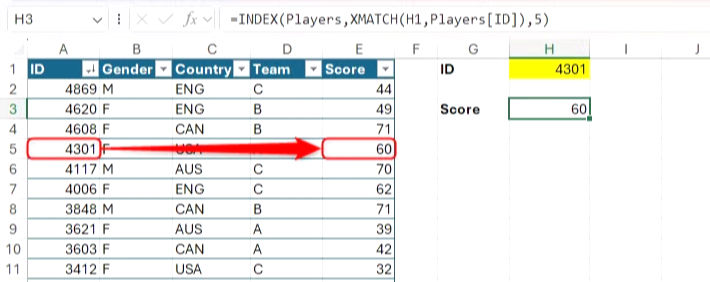 INDEX와 XMATCH를 함께 사용하면 단일 기준에 따라 단일 값을 반환할 수 있습니다. 이 예에서는 INDEX와 XMATCH를 함께 사용하여 H1 셀에 ID가 있는 플레이어의 점수(Players 테이블의 5열)를 반환합니다.