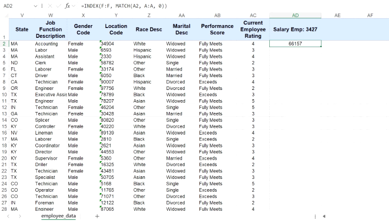 이 예에서 MATCH 부분은 먼저 A2 셀에 있는 직원 ID의 행 번호를 찾습니다. 그런 다음 INDEX 부분은 해당 번호를 가져와 급여 구역 열(F열)의 해당 행에서 값을 반환합니다. 이는 가볍고 효율적인 방법입니다.