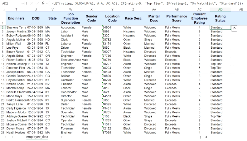 이 수식은 A2 셀에서 직원 ID를 조회하고 , 열 AC 에서 숫자 등급을 검색한 다음 성과를 분류합니다.