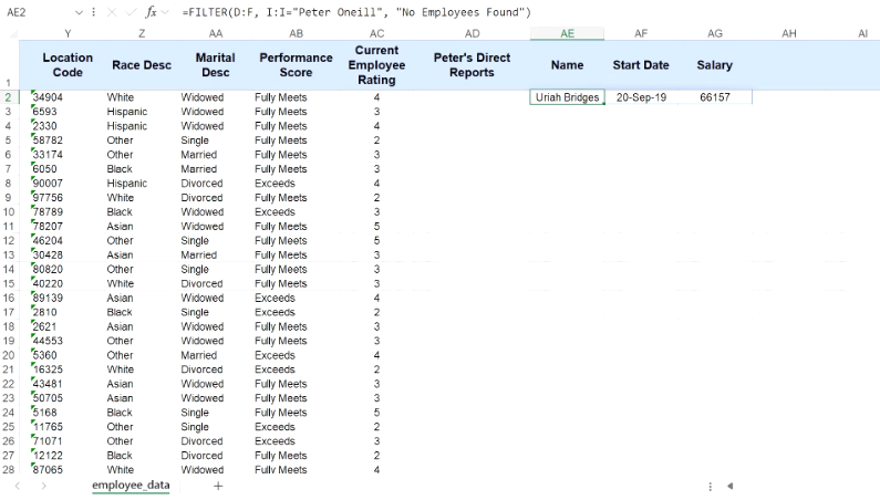 예를 들어, Perter Oneill이라는 이름의 관리자가 직속 부하직원 전체 목록을 원한다고 가정해 보겠습니다. FILTER 함수를 사용하면 여러 번 개별적으로 조회할 필요 없이 단 하나의 수식만으로 전체 목록을 조회할 수 있습니다.