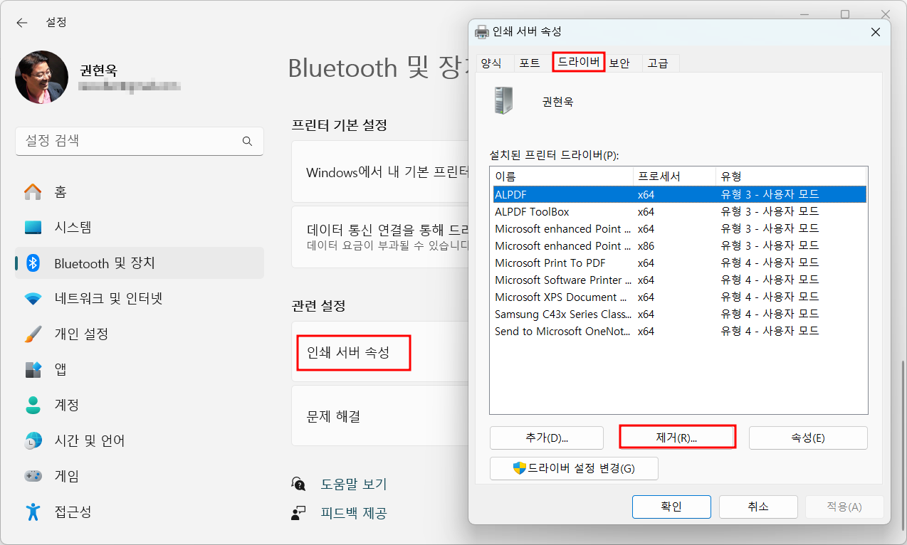 프린터 장치를 제거해도 드라이버가 완전히 제거되지 않아 프린터 작동이 중지되는 경우도 있습니다. 이런 상황에서는 인쇄 서버 속성 대화 상자를 사용하여 설치된 프린터 드라이버를 제거할 수 있습니다.