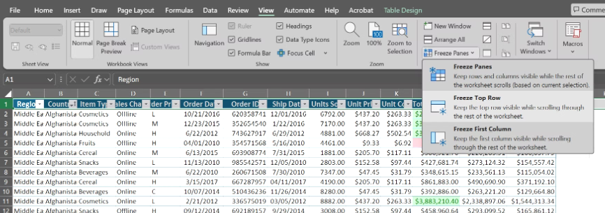 해결 방법은 간단합니다. 머리글 행(및 직원 ID나 제품 상태처럼 항상 표시해야 하는 다른 Excel 행이나 열 )을 강조 표시합니다. 그런 다음 [보기] 탭 - [틀 고정]으로 이동합니다.