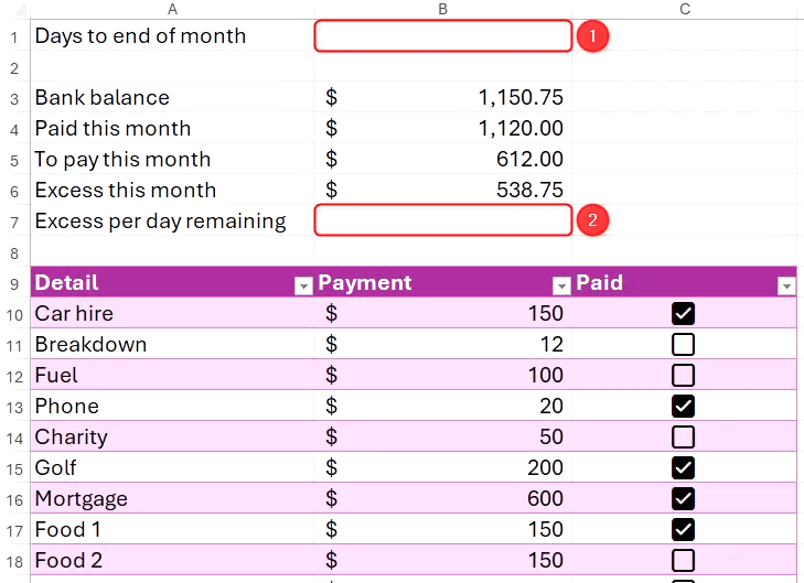 각 월별 예산을 별도의 워크시트에 정리한 Excel 통합 문서를 만들었다고 가정해 보겠습니다. 체크박스 와 SUMIF 함수를 사용하여 완료된 지출과 예정된 지출을 계산하는 것 외에도, EOMONTH 함수를 사용하여 해당 월의 남은 일수를 계산하고, 이를 통해 매일 지출할 수 있는 최대 금액을 계산하려고 합니다.