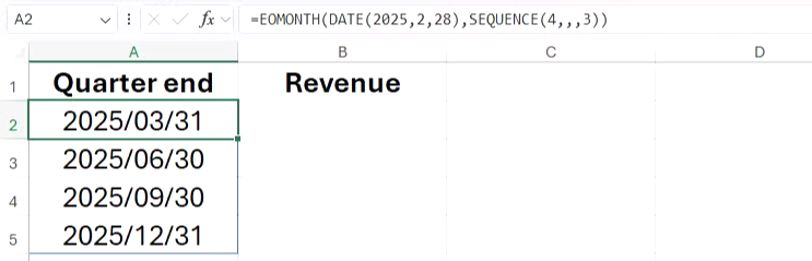 여기서 수식의 EOMONTH 부분에 있는 시작 날짜는 1분기가 끝나기 전 달의 날짜이고, 수식의 SEQUENCE 부분에 있는 첫 번째 인수는 Excel에 4행의 결과를 반환하라는 것을 알려주고, 네 번째 인수는 Excel에 각 결과 사이에 3개월(1년 분기)을 건너뛰라는 것을 알려줍니다.