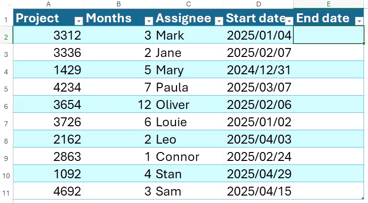 날짜와 개월 수를 하드코딩하는 대신 셀 참조를 사용하면 두 가지 이점이 있습니다 . 첫째, 수식이 각 행의 데이터에 따라 정확하게 계산됩니다. 둘째, 특정 프로젝트의 기간이나 시작일을 변경해야 하는 경우 수식을 편집하지 않고도 B열이나 D열의 값만 수정하면 됩니다.