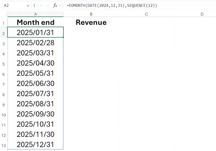 SEQUENCE 함수는 Excel에 12행 시퀀스를 반환하도록 지시하고, EOMONTH 함수는 시퀀스를 2024년 12월 31일 이후의 달부터 시작하는 월말 날짜 배열로 정의합니다.