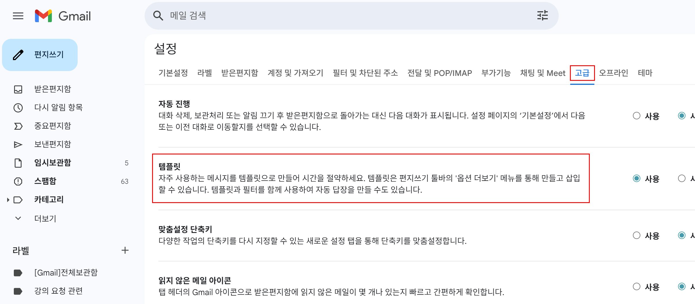 템플릿을 사용하려면 [설정] - [고급] 탭에서 [사용]을 클릭합니다. Gmail이 새로고침되면 템플릿을 만들 수 있습니다.