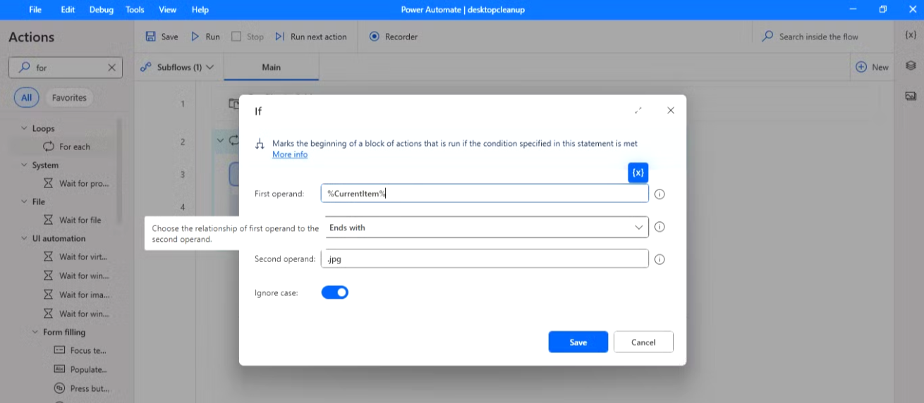 이제 Power Automate가 데스크톱의 모든 파일을 보고 적합한 파일을 선택하도록 설정해 보겠습니다. 확장자를 기록하도록 설정하면 됩니다. 예를 들어, 이미지 파일의 확장자는 파일 끝에 .jpg, .jpeg, .png 또는 .webp가 붙습니다. 따라서 연산자로 "끝남"을 선택합니다.