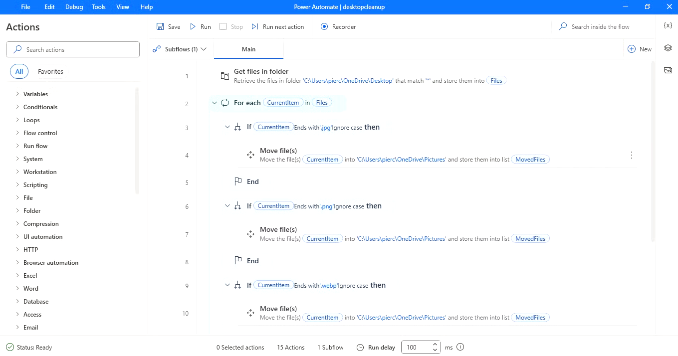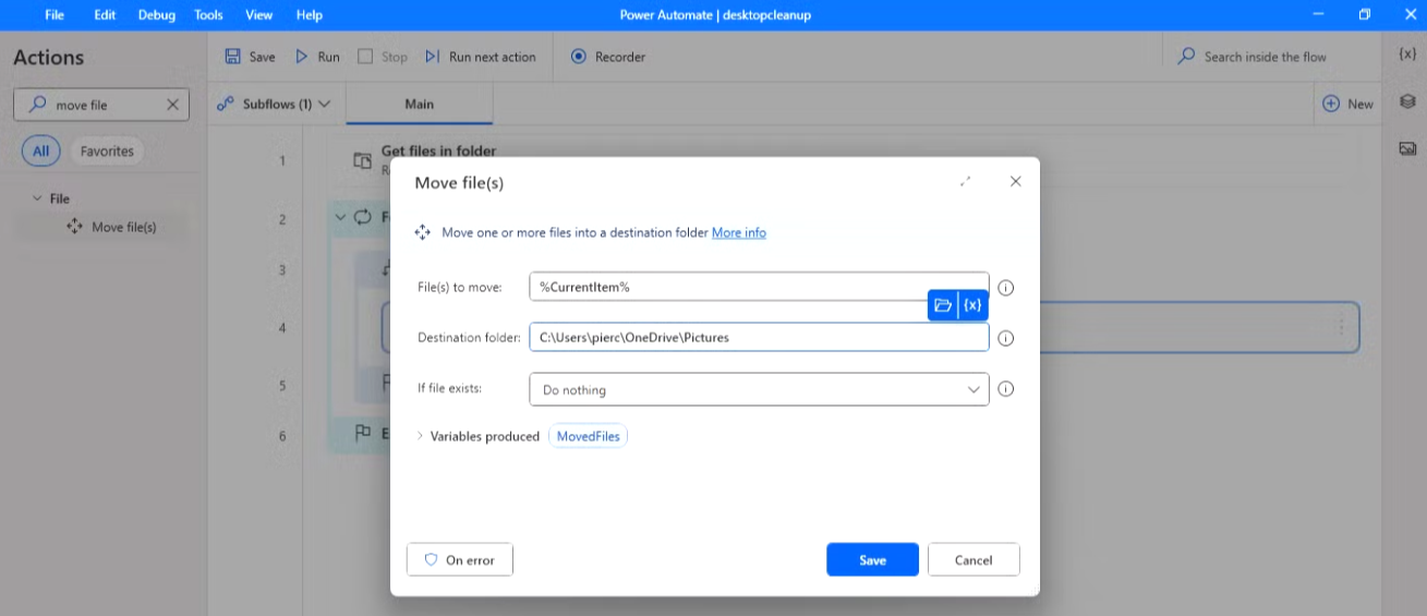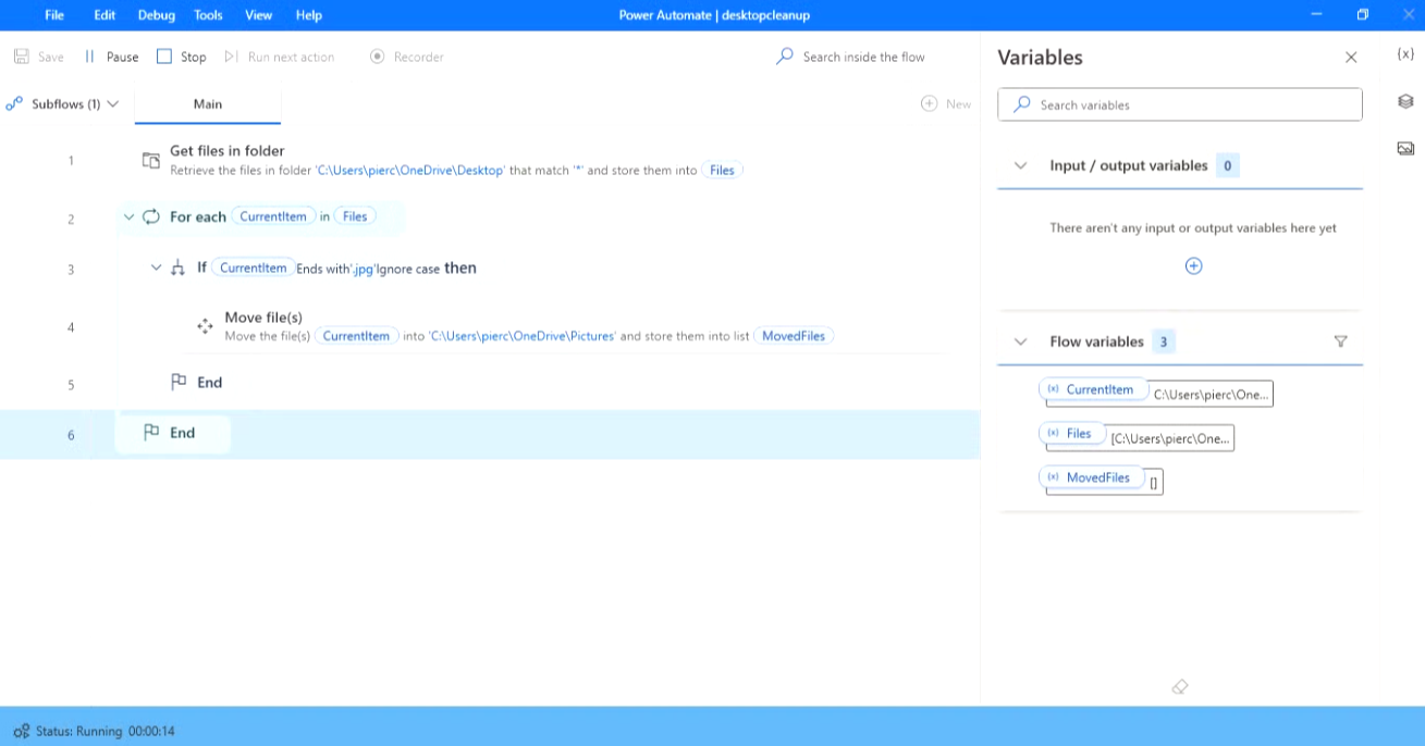이제 첫 번째 Power Automate 플로우를 살펴보겠습니다. 데스크톱의 모든 파일을 스캔하고 JPG 파일을 찾아 자동으로 그림 폴더로 옮겨줍니다.