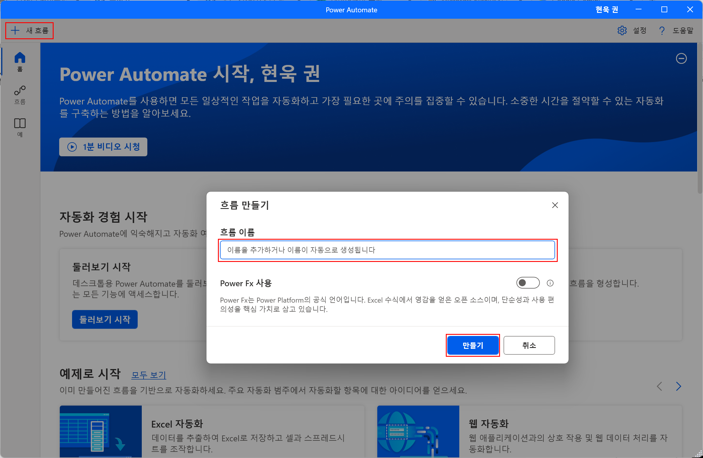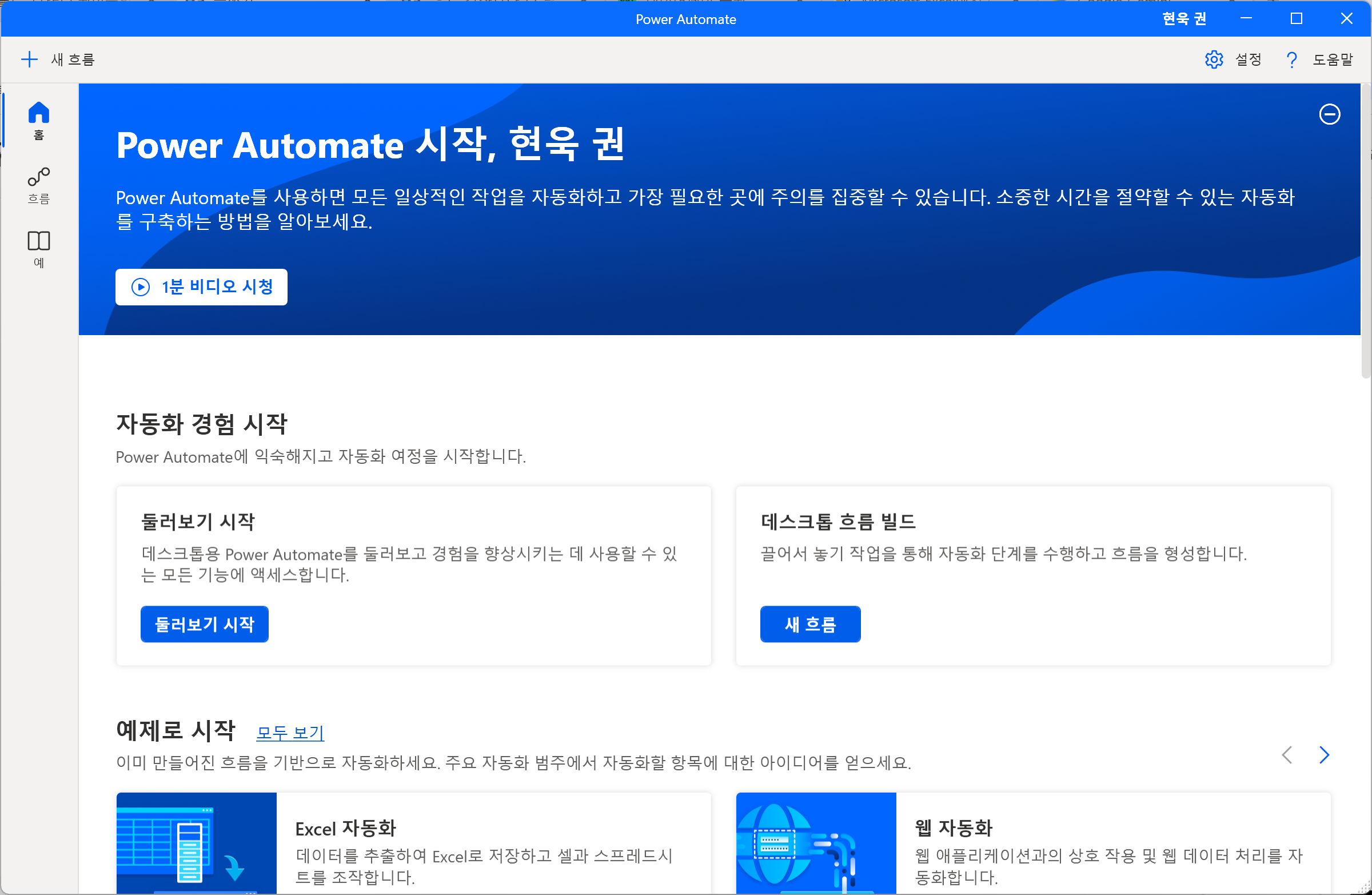 먼저 Power Automate에 대해 알아보겠습니다. 시작 메뉴를 열고 Power Automate를 검색 하여 앱을 실행하세요. 처음 실행하면 환영 안내가 나오는데, 원하시면 건너뛸 수 있습니다. 이제 대시보드로 이동했습니다.
