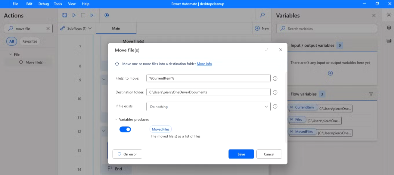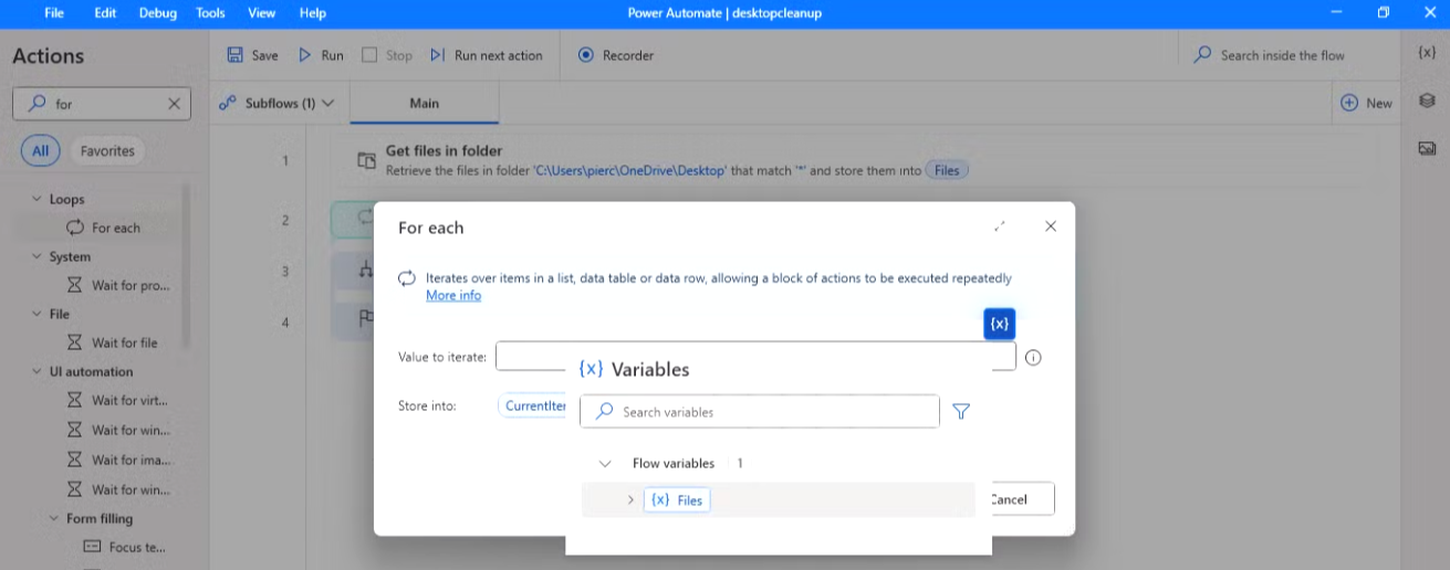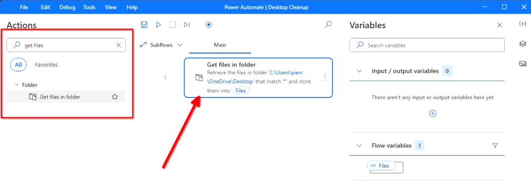 첫 번째 작업은 이제 Main 흐름에 있으며, 출력을 "Files" 변수에 저장하는 것입니다. 파일을 가져오는 것이 첫 번째 단계입니다. 다음 단계는 파일을 관련 폴더로 다시 라우팅하는 것입니다. 지금 바로 시작해 보겠습니다.