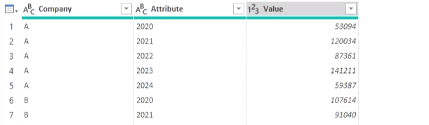 아래 스크린샷에서는 여러 열에 회계 데이터가 포함되어 있습니다. 모든 재무 수치가 한 열에 있는 것이 좋습니다. 그래야 필터링하고 비교하기가 더 쉽습니다. 즉, 각 행에는 회사, 연도, 그리고 값이 포함되어야 합니다. 즉, 이 세 가지 변수를 기준으로 데이터를 쉽게 정렬하고 필터링할 수 있습니다. 파워 쿼리에서 이러한 구조 조정 단계를 "데이터 피벗 해제"라고 합니다.