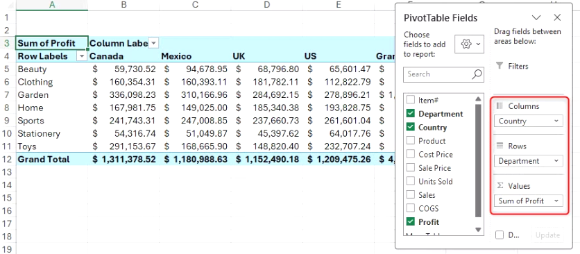 (4) 피벗 테이블 필드 창의 다른 영역으로 필드를 이동하면 피벗 테이블이 형성되는 것을 볼 수 있습니다. 이 간단한 프로세스의 결과로, 이제 국가 및 부서별로 수익을 빠르게 비교할 수 있는 방식으로 데이터가 재구성되었으며, 원래 데이터 세트는 변경되지 않은 상태로 유지됩니다.