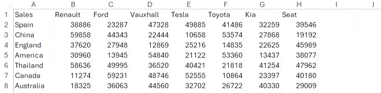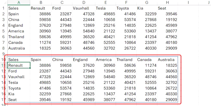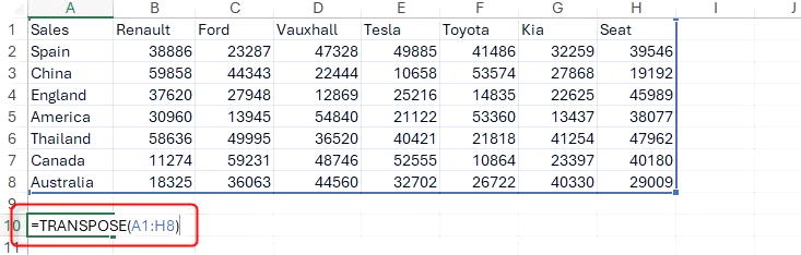 예를 들어, 이 배열을 뒤집어서 맨 위 행에 국가를, 첫 번째 열에 자동차 브랜드를 포함시키려고 한다고 가정해 보겠습니다.
