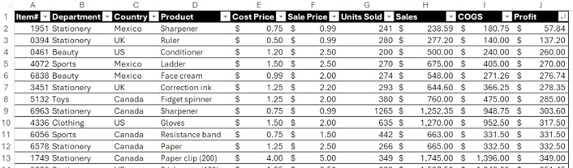각 행에 판매된 제품에 대한 다양한 세부 정보가 포함된 다음 Excel 표를 예로 들어 보겠습니다. 구체적으로, 국가별 각 부서의 수익을 비교한다고 가정해 보겠습니다.