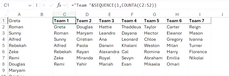 그런 다음, 직접 입력하거나 수식을 사용하여 결과 데이터 위에 팀 이름을 추가할 수 있습니다. 다음 예에서는 SEQUENCE와 COUNTA 함수를 사용했습니다.