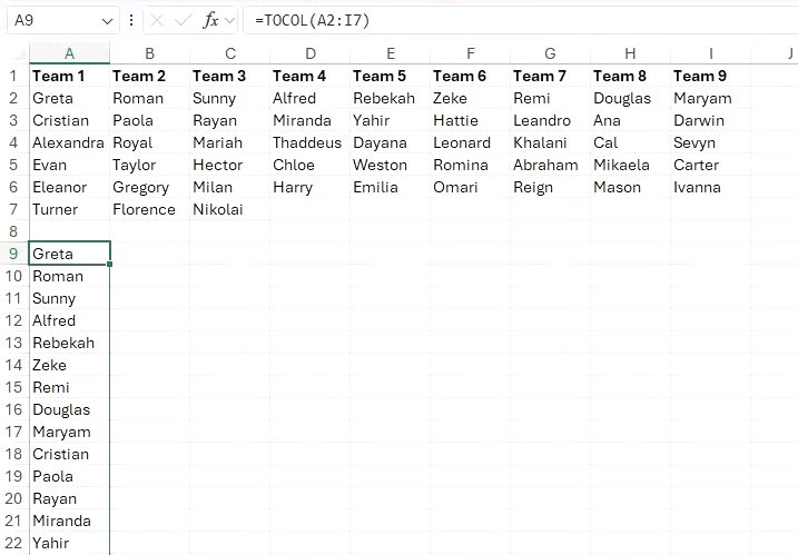 이제 팀당 최대 선수 수를 정의하는 대신 전체 팀 수를 제한한다고 가정해 보겠습니다. 구체적으로, 선수들을 9개 팀으로 나누어 각 행에 최대 9명의 이름을 입력할 수 있도록 하려고 합니다. 이렇게 하려면 다음과 같이 입력합니다.