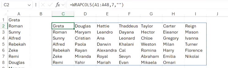 =WRAPCOLS(A1:A48, 7, "")