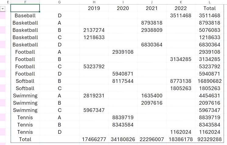 =PIVOTBY(Sports_Viewers[[Sport]:[Region]], Sports_Viewers[Year], Sports_Viewers[Viewers], SUM)